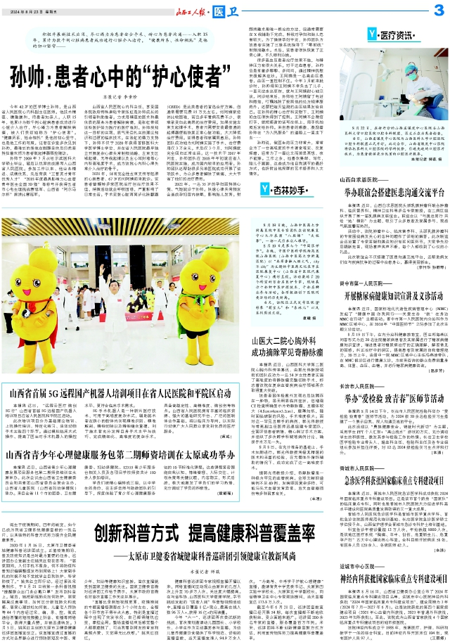 8月19日晚,山西中医药大学附属医院中医专家团队在该院康复中心大厅表演 “八段锦” “太极拳”,一招一式引来众人跟学。 8月19日是第七个“中国医师节”。当晚,中国中医科学院西苑医院山西医院(山西中医药大学附属医院)以“本草香融入烟火气,city不city”为主题的中医药文化夜市在医院康复中心(山西省中医现代康复中心)精彩呈现。活动集结了20个科室的百余名医护专家,现场展示十余种中医护理技术,千余名群众参与活动。各项数据创下医院同类活动的历史新高。 当天,该院还正式发布医院IP形象“葫宝儿”和 “杏林儿”以及系列周边文创。康曦摄