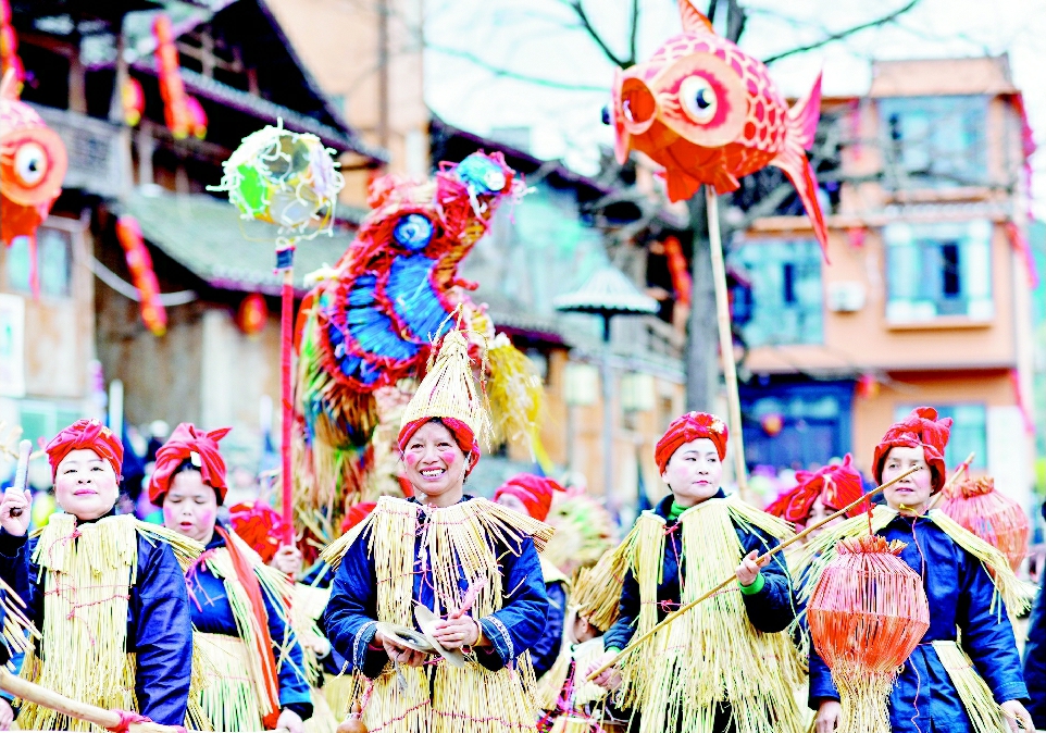 日前,贵州省黔东南苗族侗族自治州榕江县三宝侗寨举办2025年“萨玛节”活动,数千名侗族群众参加祭萨仪式、千人多耶、舞稻草龙等民俗活动。“萨玛”系侗语,意为“大祖母”,是侗族人民共同祖先的化身。2006年,侗族萨玛节被列入第一批国家级非物质文化遗产名录。图为当地群众在“萨玛节”活动中舞稻草龙。 (据新华社3·15杨文斌)